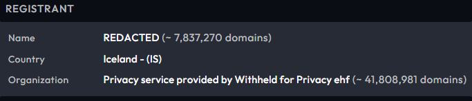 - Registration privacy While domain privacy is not inherently malicious, it is frequently used in phishing campaigns to obscure registrant identity. As seen in Figure 4, the registrant's information has been redacted for privacy, which raises a red flag.