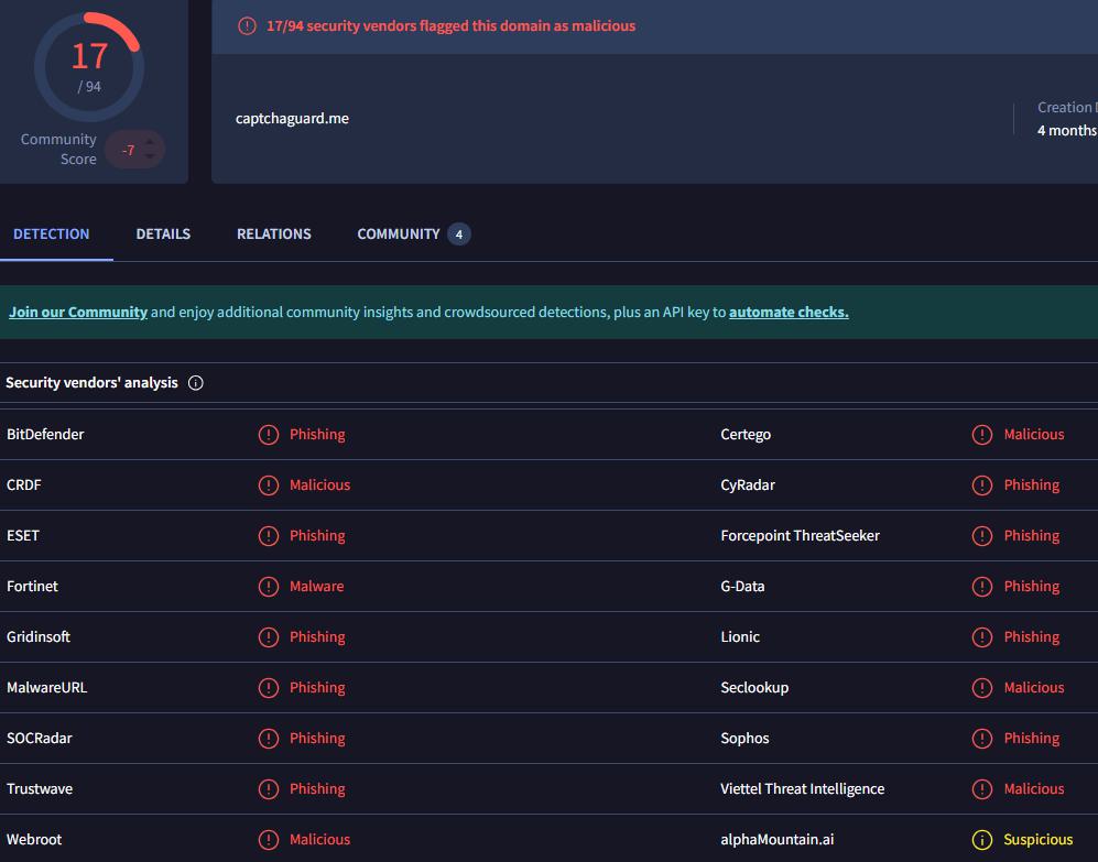 Centripetal’s contribution to the broader analysis of this campaign places special emphasis on the phishing domain captchaguard[.]me, which was used to lure victims into interacting with a ClickFix-style social engineering prompt. Our focus is to dive deeper into this specific domain to uncover additional behavioral indicators and techniques not covered in other public reports, particularly those related to user deception and social engineering. While Check Point has published an extensive technical breakdown of the malware’s delivery mechanisms and infection stages (CheckPoint, 2025), our analysis aims to complement their findings by shifting attention to the psychological and interaction-based tactics employed in the initial stages of the attack.