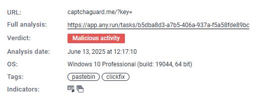 Although this analysis focused on a single domain observed in the campaign, blocking access to it significantly disrupts the attack chain. In this case, captchaguard[.]me served as a key redirection point for delivering the ClickFix lure. Preventing access to the domain stops the redirection flow and blocks malware execution before it begins, effectively neutralizing the threat at an early stage.