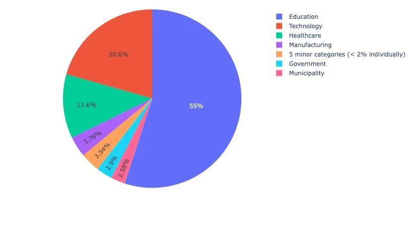 From a targeting perspective analyzing observed traffic, Figure 10 shows that Magecart infrastructure disproportionately affected the education sector (55%), followed by technology (20.6%) and healthcare (11.6%). This trend is likely driven by the education sector’s widespread reliance on third-party payment processors, e-commerce platforms, and outdated or unpatched web infrastructure—factors that create fertile ground for supply chain exploitation. Notably, past Magecart attacks such as the compromise of Blue Bear Software—a vendor servicing school accounting portals—exposed sensitive payment data from online campus stores (Threatpost, 2019). These patterns reflect an opportunistic targeting strategy aimed at institutions with broad attack surfaces and limited defensive resources.