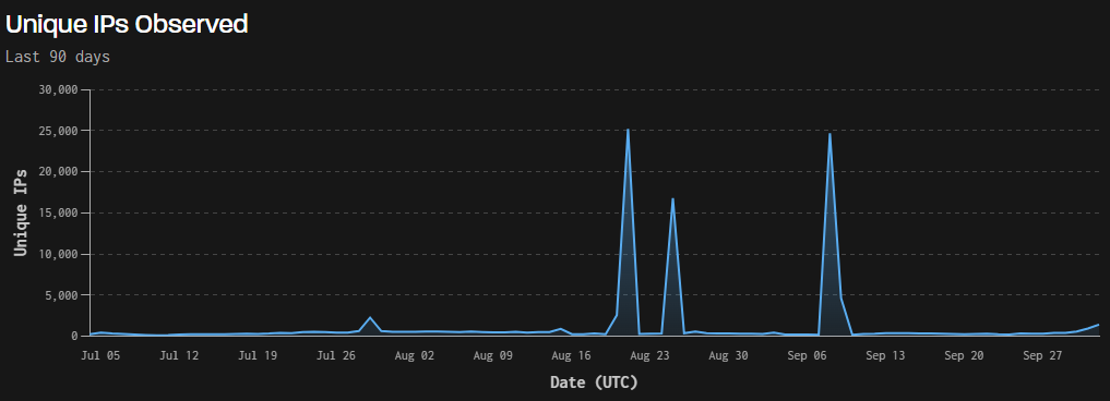Observing Figure 4 with the activity observed by GreyNoise (Figure 5; GreyNoise, 2025) at the end of September would infer that the targeted scanning was being conducted in waves in advance.