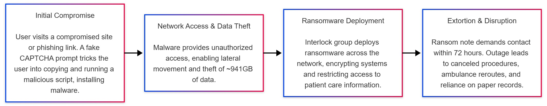 - May 20, 2025: Attack is detected; system-wide outage forces staff to revert to manual processes.