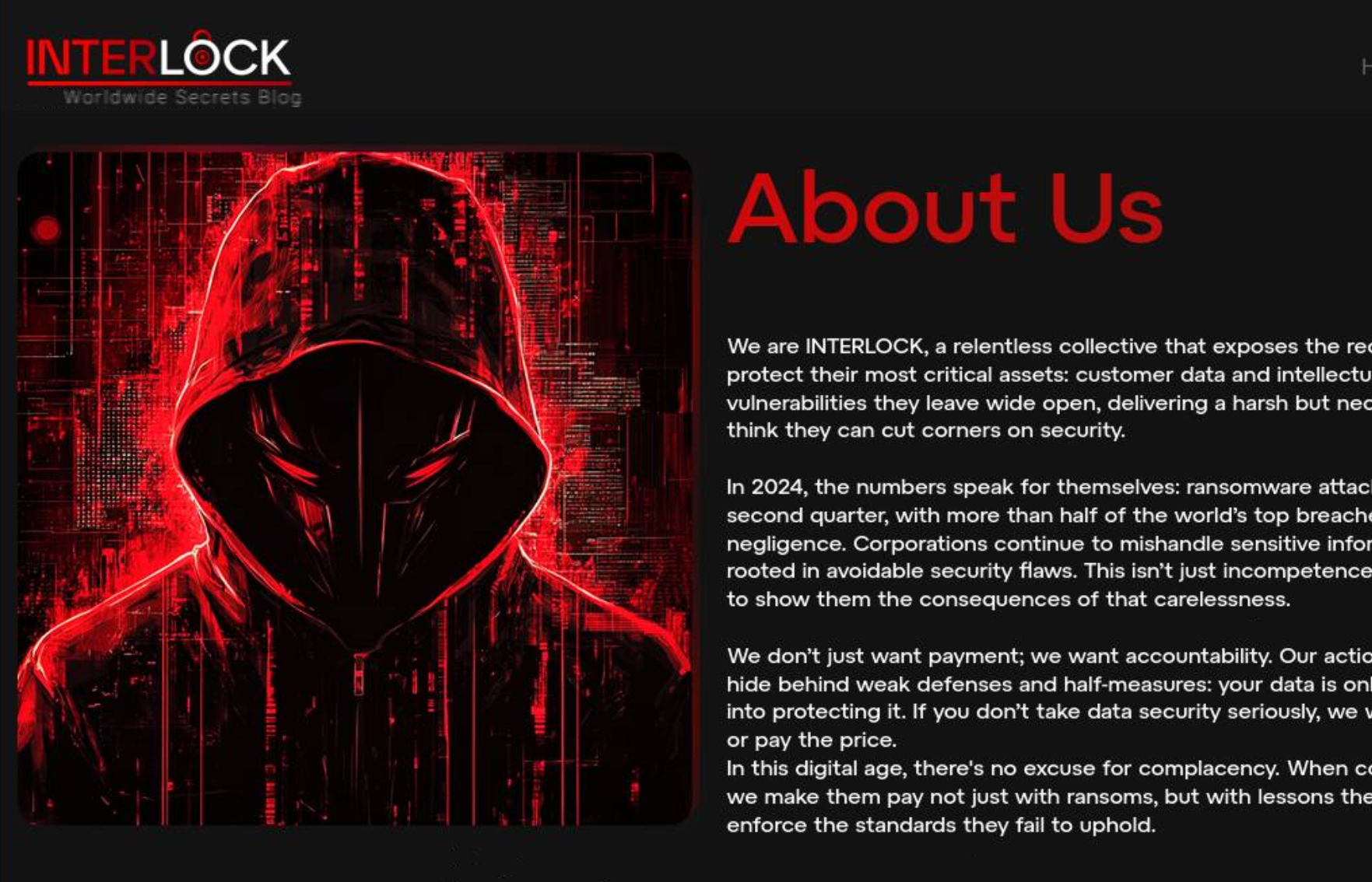 Interlock operates as a privately run ransomware group, not a traditional RaaS program. Research indicates no public affiliate recruitment, and campaigns appear to be conducted by a single, centralized operator rather than a large affiliate ecosystem. The group also maintains a private leak site known as the “Worldwide Secrets Blog”, which is used to publish sensitive data stolen from victims who refuse to pay. The site functions as the group’s public pressure mechanism, listing victim organizations, displaying breach announcements, and hosting links to leaked files. (Figure 2)