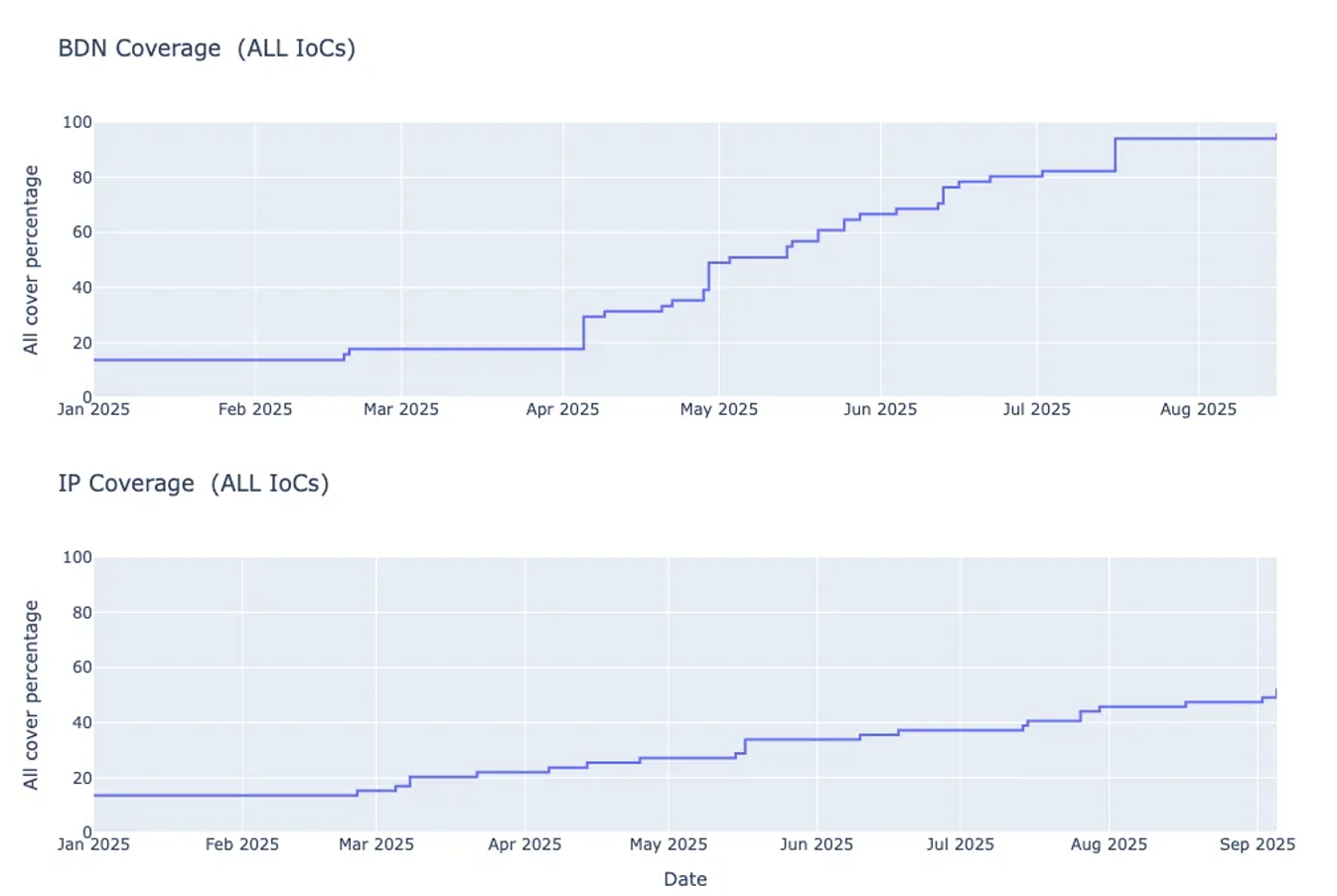 To contrast these findings with the previous attack timeline, we analyzed indicators in Centripetal’s threat intelligence month by month to align with periods where Interlock demonstrated the highest activity. During April 2025, nine attacks were recorded according to the referenced analysis. To illustrate the pace at which indicators are identified, incorporated, and deployed within Centripetal’s threat intelligence and across our customer environments, the graphs in Figure 6 show the progression of coverage for these indicators of compromise as attacks unfolded throughout the second quarter of 2025.