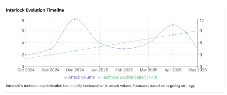 When viewed alongside sector distribution data and external assessments, the updated timeline provides additional confirmation. Interlock’s operational tempo and targeting preferences remain steady, with healthcare serving as its primary point of impact. The alignment between our internal telemetry, Hunter Strategy’s analysis, and publicly documented attack sequences reflects a coherent pattern of behavior that underscores the group’s sustained and deliberate campaign strategy. Interlock continues to prioritize high value environments where operational disruption has immediate and severe consequences.