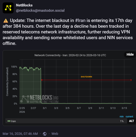 Iran's civilian internet connectivity has been confirmed at 1-4% of normal capacity since February 28. NetBlocks has since confirmed a further collapse on AS12880, a key Iranian telecoms network that had remained partially online as part of the reserved state infrastructure. With AS12880 now dark and instability confirmed on the NIN domestic intranet, the effective connectivity floor has dropped below the previously cited figure. Active signals from Iranian IP space during this period are therefore less likely to reflect routine noise, which raises analytical confidence on behavioral attribution signals. The Iranian regime has also begun arresting Starlink users, confirming it is aware that satellite connectivity represents a bypass of the domestic blackout and is actively attempting to suppress it in the general population. (France24, 2026)