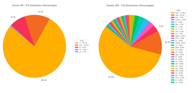 Overall, Tycoon’s concentration on .ru suggests a high-risk, high-volume model with predictable blocking patterns, while Sneaky’s approach favors persistence through reputable TLDs and a more balanced distribution.