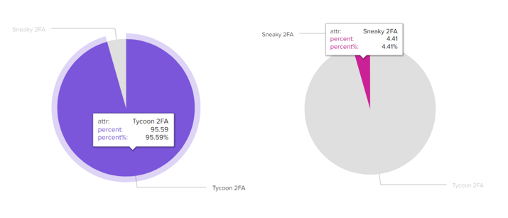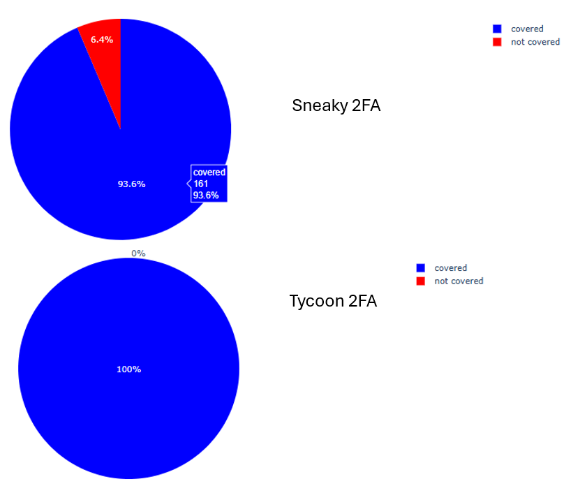 Centripetal’s threat intelligence coverage for the Sneaky 2FA and Tycoon 2FA IOCs referenced in this report for 2025 shows a notable disparity between the two campaigns. Sneaky 2FA maintained a high coverage rate of 93.6%, with 6.4% of IOCs not covered at the time of sampling. Although there are some IOCs identified as not covered in the Sneaky 2FA campaign, the low percentage of recorded findings suggests minimal impact on overall detection capability. In contrast, Tycoon 2FA achieved full coverage, with 100% of identified IOCs included in Centripetal’s detection scope. These findings indicate consistently strong visibility for both campaigns, though a small portion of Sneaky 2FA infrastructure remained outside immediate coverage. (Figure 13)
