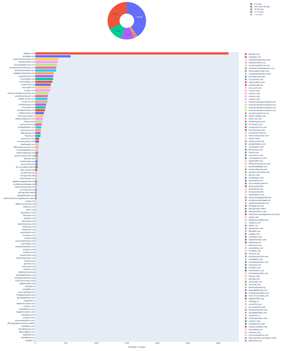 The initial analysis of the timeframe between domain creation and first appearance in CTI for the Sneaky 2FA campaign shows an average of 113 days for domains not previously identified in Centripetal’s threat intelligence. Notably, over 32% of these IOCs went undetected for more than 90 days before being aggregated into threat intelligence datasets.