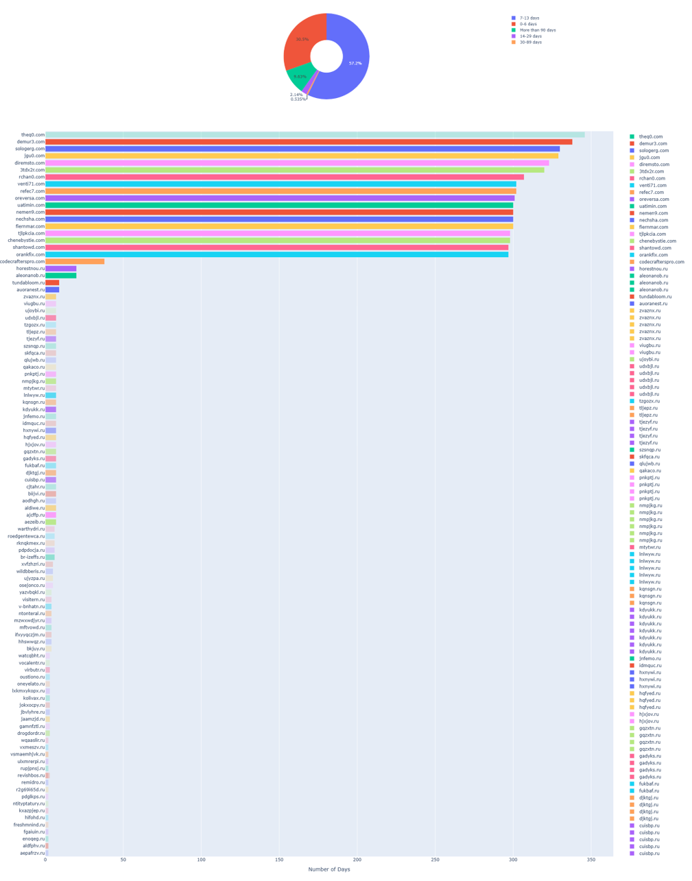 For Tycoon 2FA, the average time from domain creation to first appearance in CTI is 35 days. While the dataset analyzed for Tycoon is significantly larger than that of Sneaky 2FA, an important factor influencing the average, it is notable that the longest period a Tycoon domain went unflagged in threat intelligence was just over 300 days, compared to more than 3,000 days in the Sneaky 2FA analysis. Additionally, only 9.63% of Tycoon IOCs were first observed in CTI more than 90 days after creation, compared to 32.4% in the previous Sneaky 2FA analysis. (Figure 7)