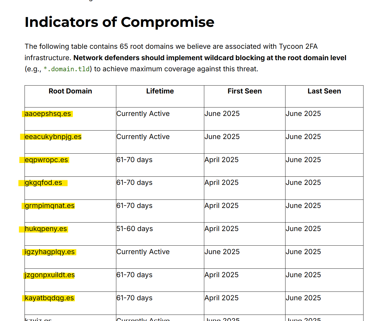 - DNSFilter - Tycoon 2FA Infrastructure Expansion: A DNS Perspective, and Release of 65 Root Domain IOCs