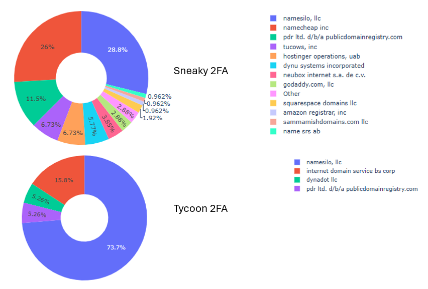 Namesilo LLC emerges as the most frequently used registrar for both campaigns, comprising 28.8% of Sneaky 2FA domains and 73.7% of Tycoon 2FA domains, as shown in figure 9 below. This indicates a strong preference for Namesilo in both operations.
